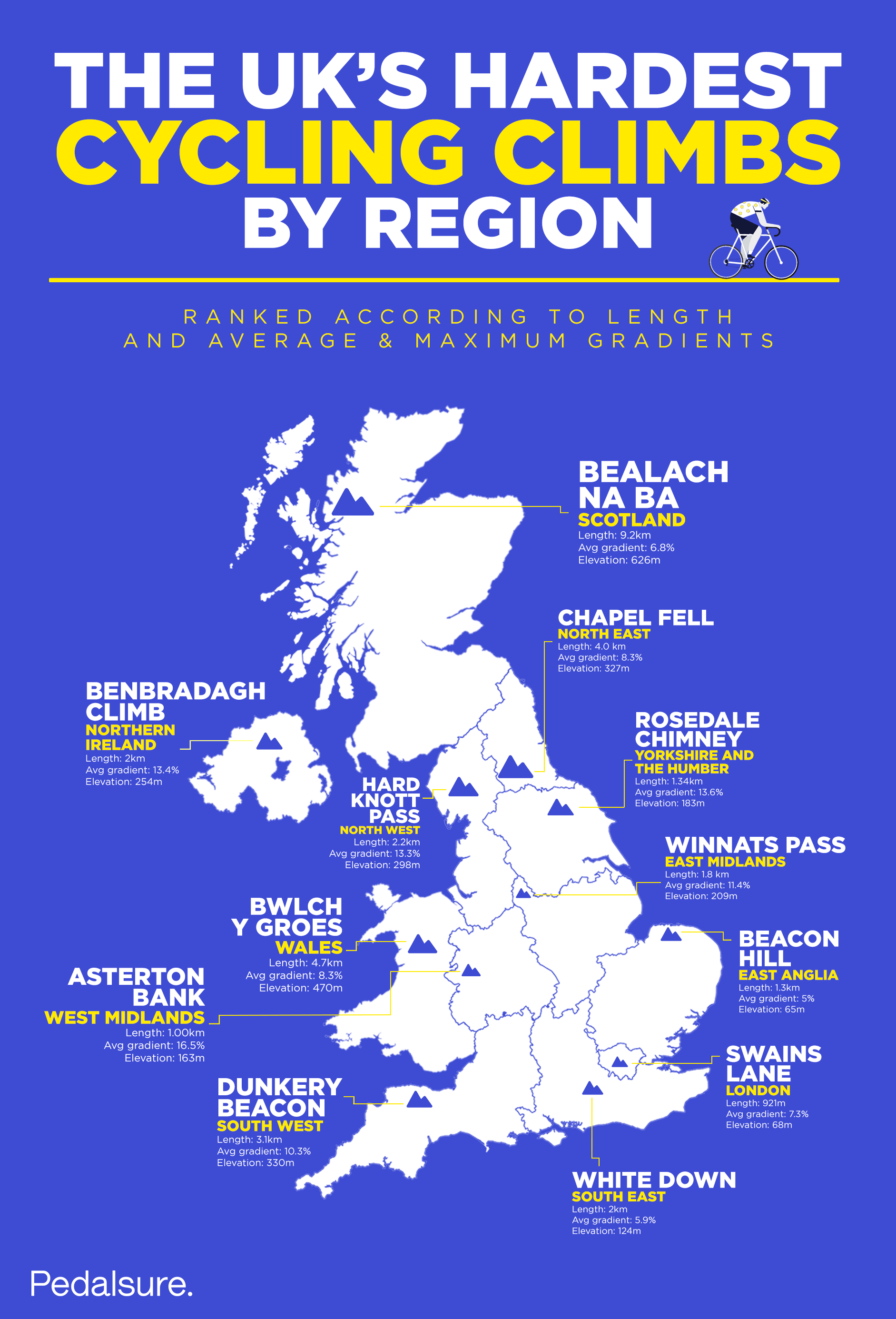 We’ve counted down the top 5 hardest cycling climbs in the UK but what about the hardest climbs in each region of the country? So here we go, we’ve ranked the UK’s hardest cycling climbs by region according to their length and average and maximum gradients. Have you tackled the toughest climb in your region?